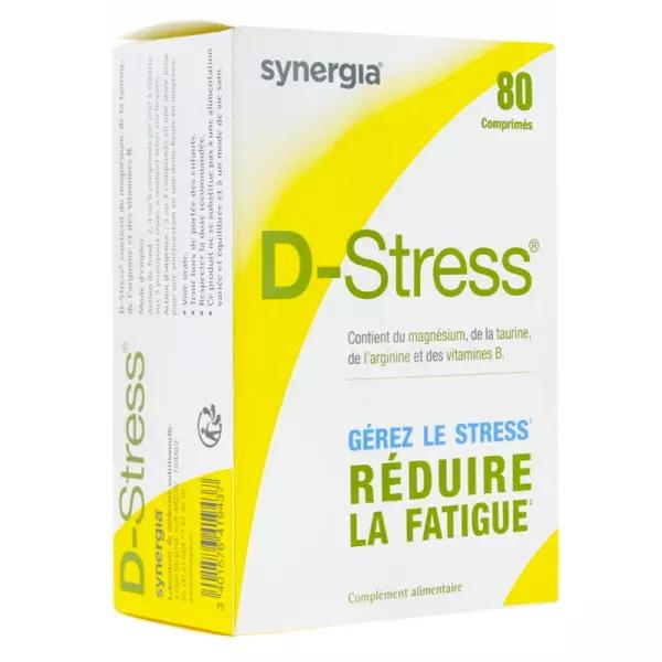 La formulazione di D-Stress è stato sviluppato dal laboratorio di medicina nutrizionale Synergia. Questo integratore alimentare è stato oggetto di un brevetto internazionale e contiene un concentrato di magnesio, taurina, arginina e vitamina b. Il magnesio e le vitamine B1, B2, B3, B6, B8 partecipano al normale funzionamento del sistema nervoso. Il magnesio e le vitamine B2, B3, B5, B6, contribuiscono al metabolismo energetico e alla riduzione dell'affaticamento. L'acido pantotenico (Vitamina B5) aiuta a ritrovare delle prestazioni intellettuali normali e a migliorare la resistenza allo stress.