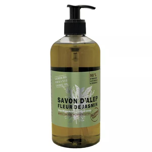 Savon Alep Liquide Fleur de Jasmin 500ml , ce savon d'Alep liquide artisanal aux vertus protectrices et purifiantes est parfait pour un soin du corps et du visage.