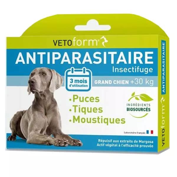 Vetoform Antiparasitaire Grand Chien +30kg 3 pipettes est un antiparasitaire à base de Margosa. Sa formule assure en 48h une efficacité sur les parasites tels que les puces, les tiques et les moustiques.
