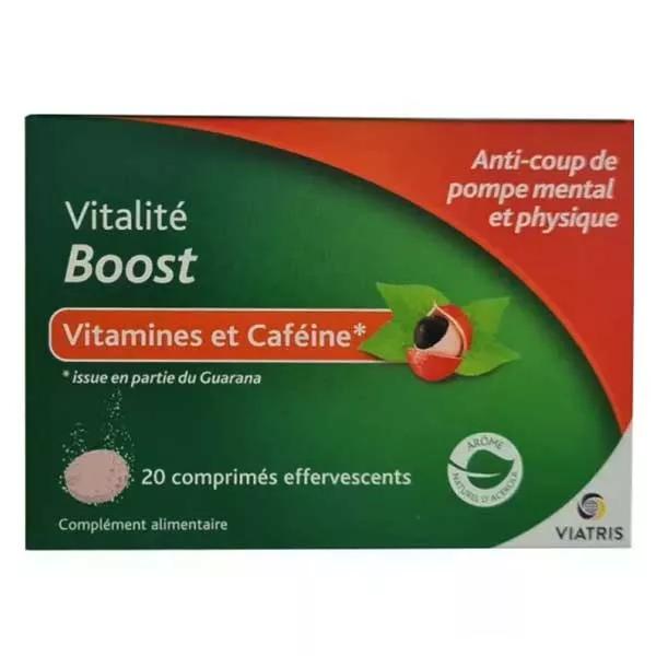 Descrizione ico-chevron-down Viatris Santé Vitalité Boost Vitamines et Guarana 20 comprimés effervescents est un complément alimentaire du laboratoire Mylan à base de Vitamines et Caféine issue en partie de Guarana.