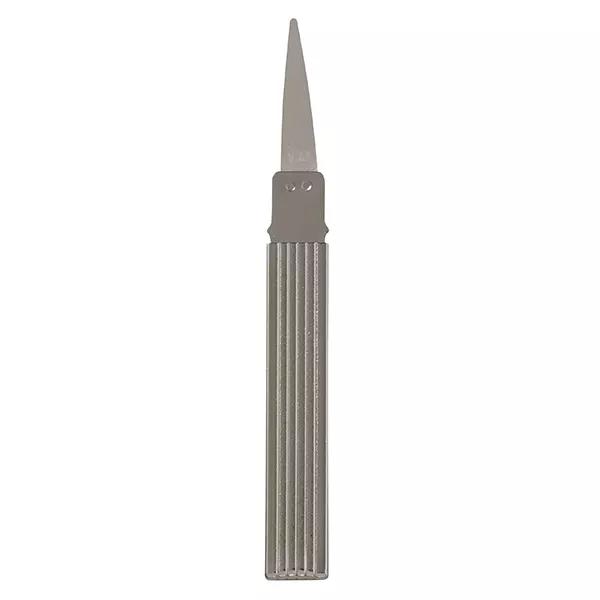 Triangolare, diventa molto affilato e arrotondato alla sua estremità, evitando il rischio di ferire la gengiva. È conservato in un supporto metallico della stessa lunghezza.